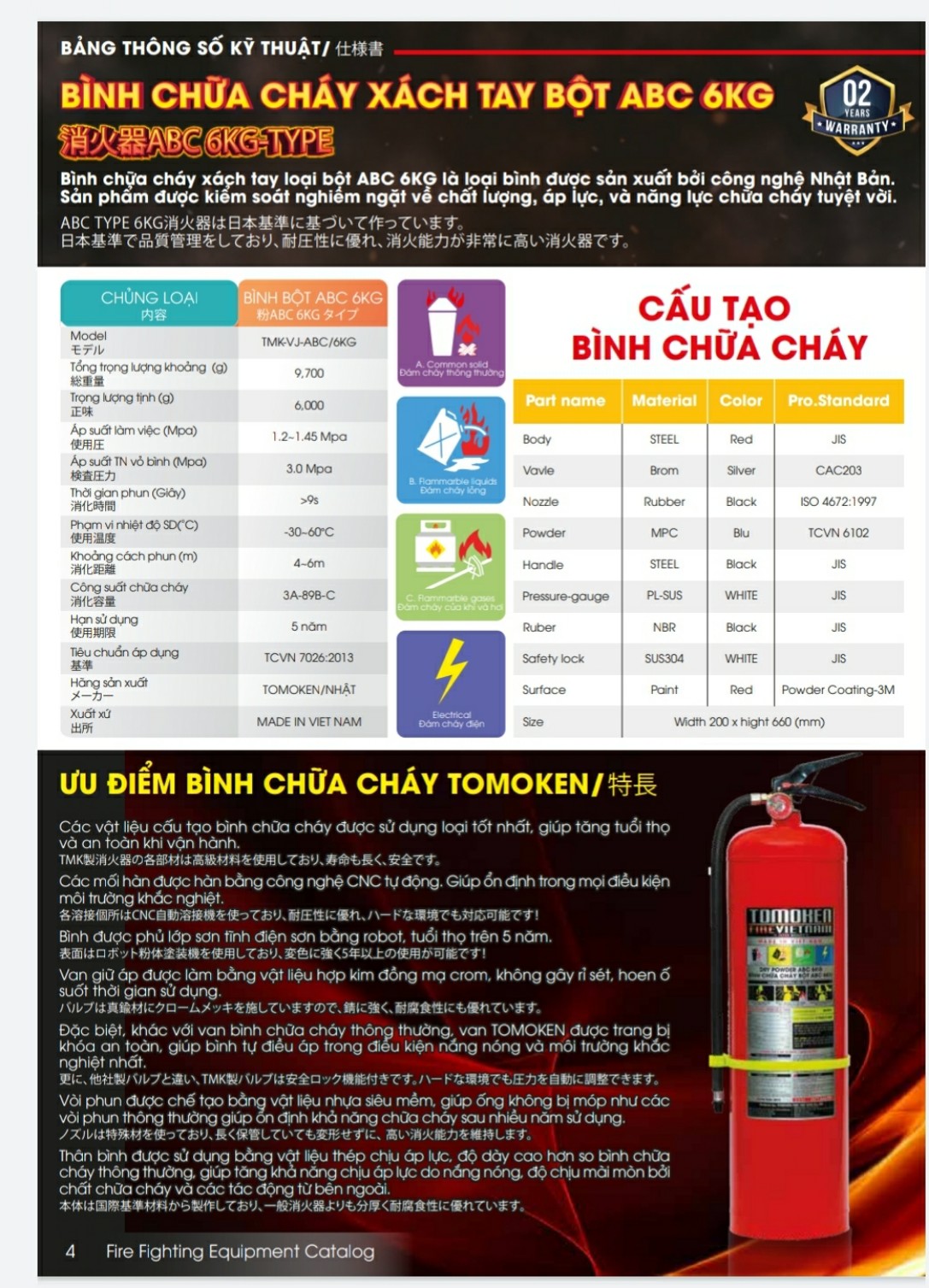 Bình chữa cháy TOMOKEN xách tay bột ABC 6kg llà loại bình được sản xuất bởi công nghệ Nhật Bản. Sản phẩm được kiểm soát nghiêm ngặt về chất lượng, áp lực và năng lực chữa cháy tuyệt vời. Được kiểm định Cục PCCC. Bảo hành 2 năm hạn sử dụng 5 năm.