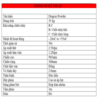 Bình chữa cháy xe đẩy Dragon Powder 35 kg BC là loại bình chữa cháy xe đẩy có thể dùng để chữa cháy tất cả các đám cháy chất rắn, chất lỏng, chất khí dễ cháy và đám cháy điện dưới 380v. Cơ chế chữa cháy là dùng bột chữa cháy phủ nên bề mặt đám cháy tạo nên lớp màng ngăn ngăn ô xy tiếp xúc với đám cháy làm tắt đám cháy.