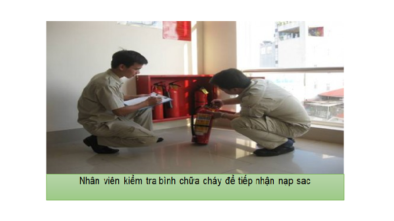 Quy tình nạp bình chữa cháy: Nhận bình chữa cháy → Kiểm tra chất chữa cháy và vỏ bình + Phụ kiện của bình → Xúc bình sạch sẽ → Nạp bột chữa cháy → Bơm áp suất → Kiểm tra, kiểm định chất lượng → Bàn giao.